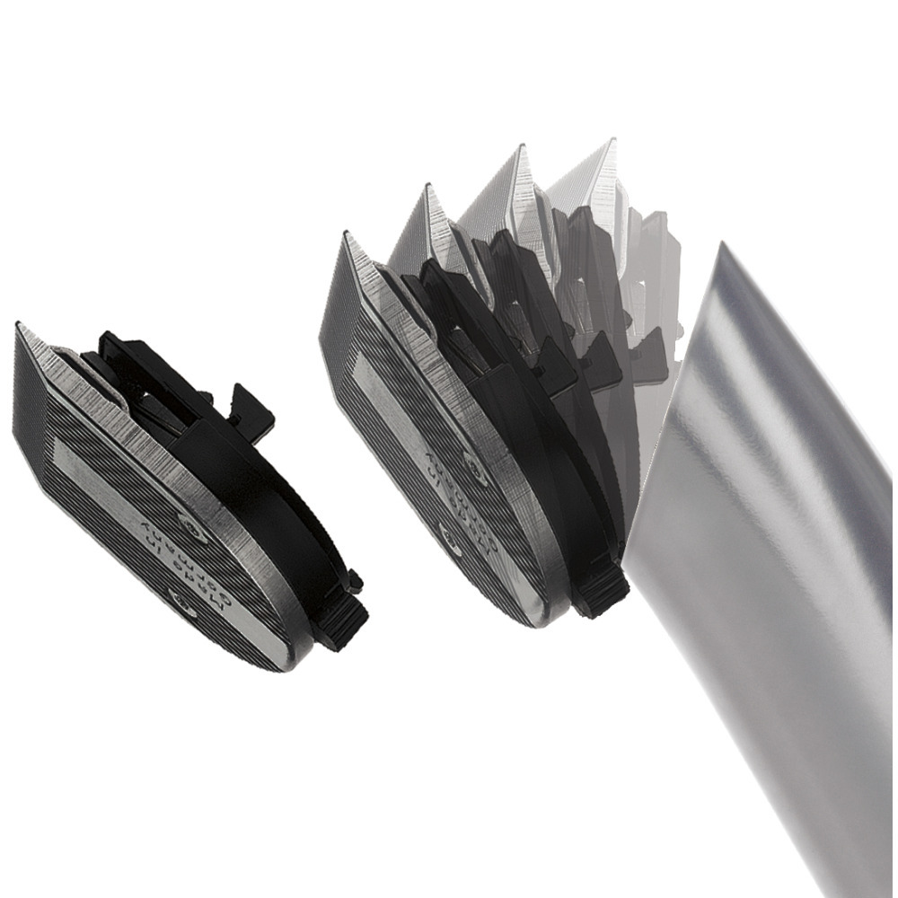 Najnovšia a najodolnejšia čierna strihacia hlavica Diamond Blade so šírkou 46 mm vyrobená z nehrdzavejúcej ocele s karbónovou vrstvou. Uhlíkový povlak s diamantovou tvrdosťou zaisťuje dokonalý a presný strih a dlhšiu životnosť.