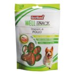 Sušené, skrútené kusy kurčiat v pásikoch bohatých na bielkoviny. Dokonalé teether. 100% prírodného pôvodu, bez umelých prísad, farbív a konzervačných látok, nízky obsah tuku a bez pridania cukru.