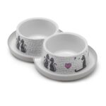Dvojitá plastová misa pre mačky s nápismi a mačkami.