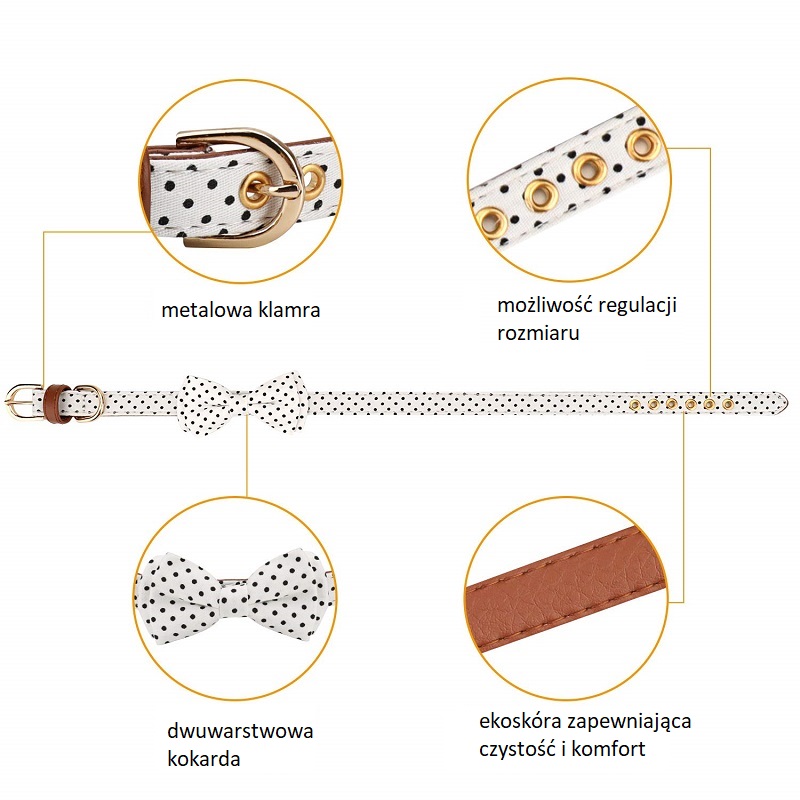Obojek je zdobený bodkovanou muškou, ktorá mu dodáva osobitý nádych. Bodkovaný vzor dodáva obojku zábavný a štýlový vzhľad, takže váš domáci miláčik určite upúta pozornosť na prechádzkach a pri iných príležitostiach.