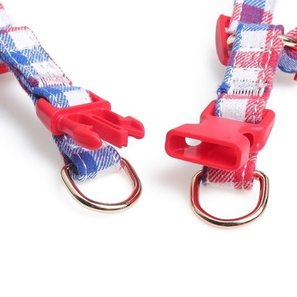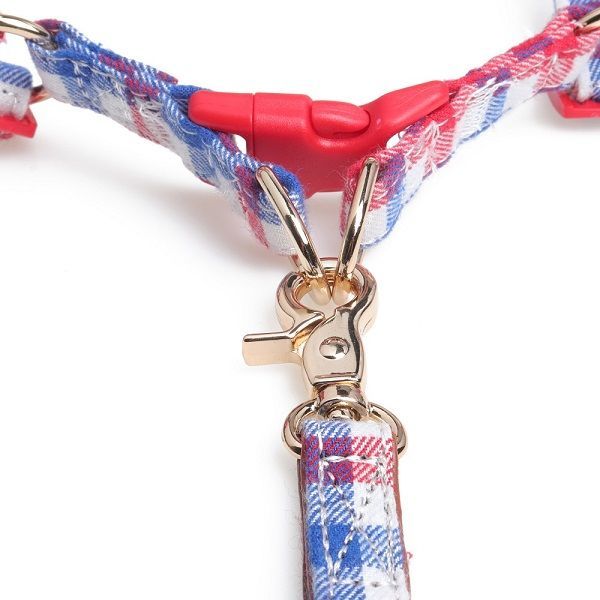 Módna, farebná súprava pre psov postroj a vodítko s kockovaným motívom, majú kovové prvky, ako je pracka, karabínku alebo polkruh na pripevnenie karabíny na vodítku.