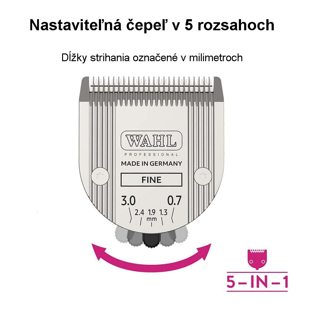 Wahl Magic Blade 5 in 1 Fine je profesionálna nastaviteľná strihacia hlavica určená na precízne strihanie jemných a ťažko dostupných oblastí, ako aj detailov, ako sú labky, ňufák, uši a chvost.